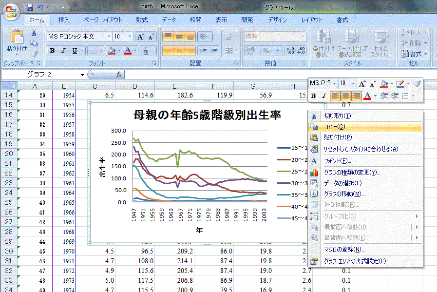 - Excelで作成したグラフをコピーします。グラフを右クリックし、コピーを選択します。